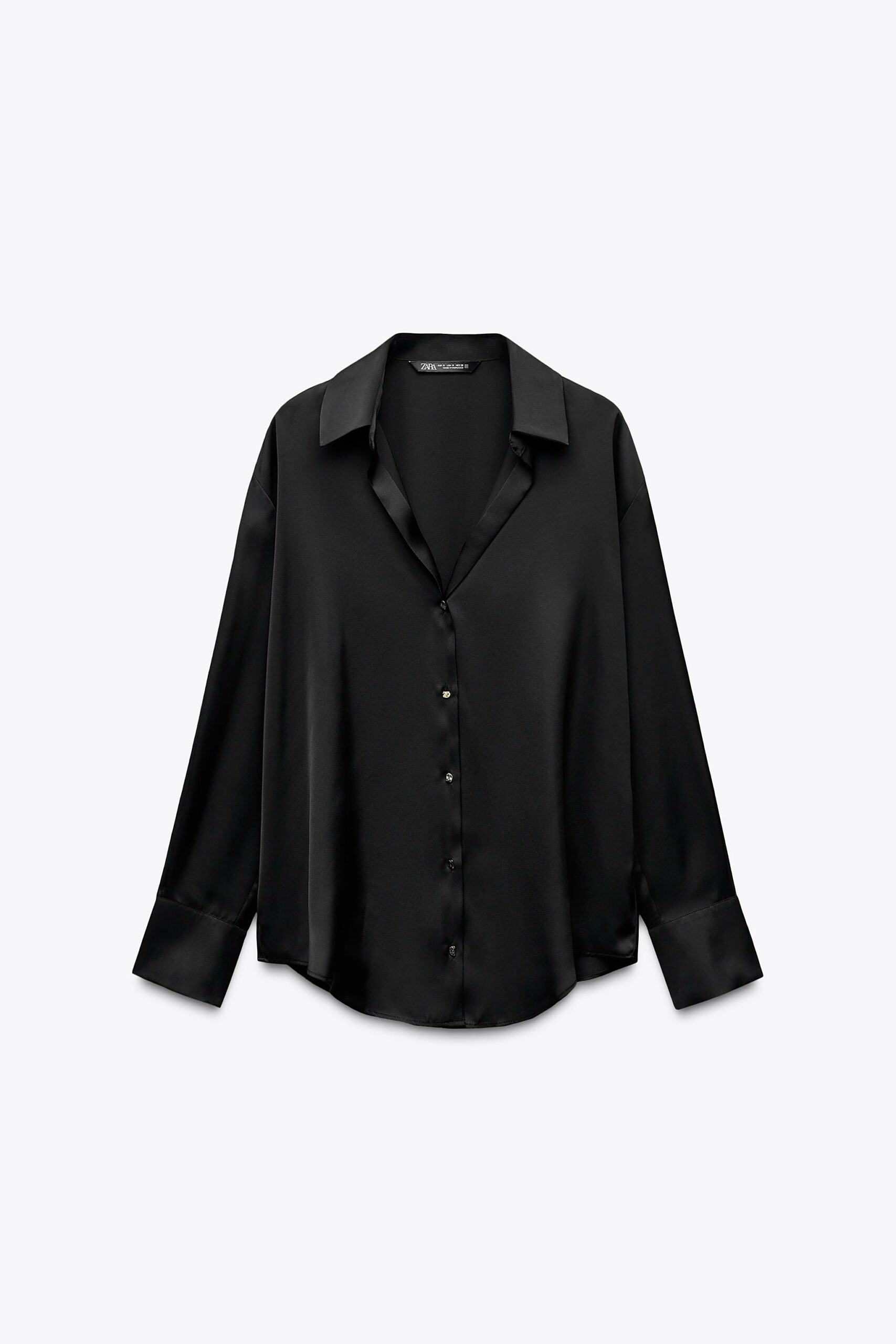 Chemise noir satiné – Taille: XS, S -Chemise avec col à revers avec col en v et manches longues. Fermeture boutonnée sur le devant – Compositions: 56% de coton, 44% de polyester.